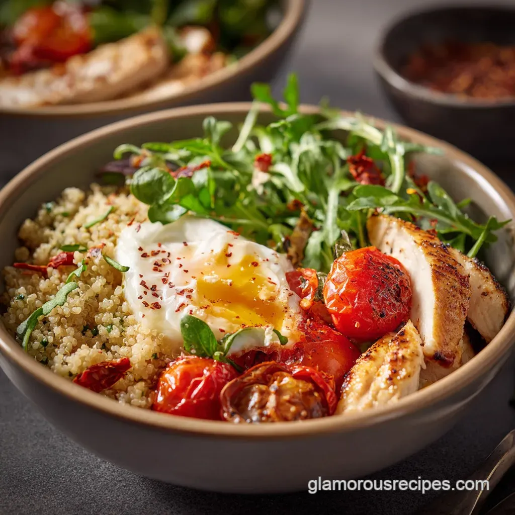 I personally prefer reheating the chicken and quinoa mix in a small pan on the stovetop with a dash of water it takes five minutes and tastes exponentially better. If you eat the bowl cold, simply slice the chicken thinner for better texture.