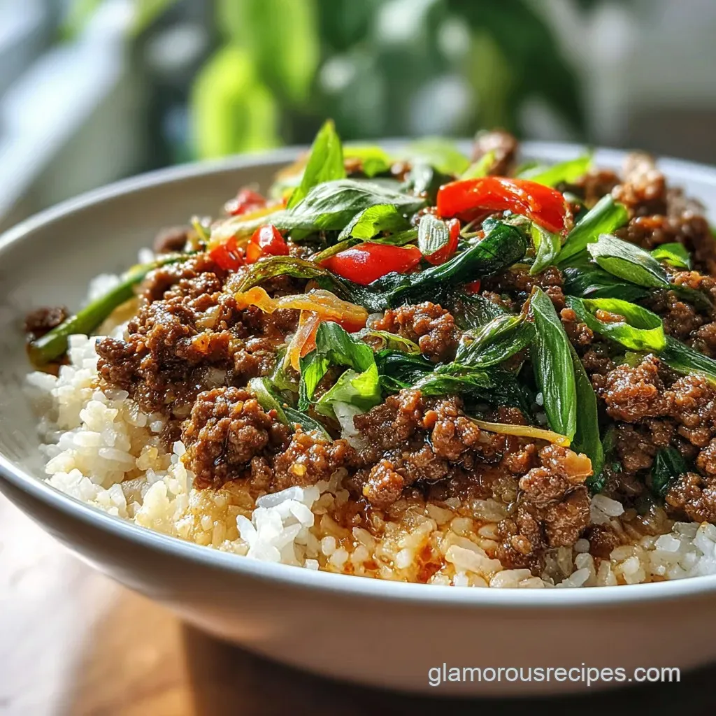 - Spicy Ground Beef Stir Fry Bowl with Garlic Veggies and Steamy Rice